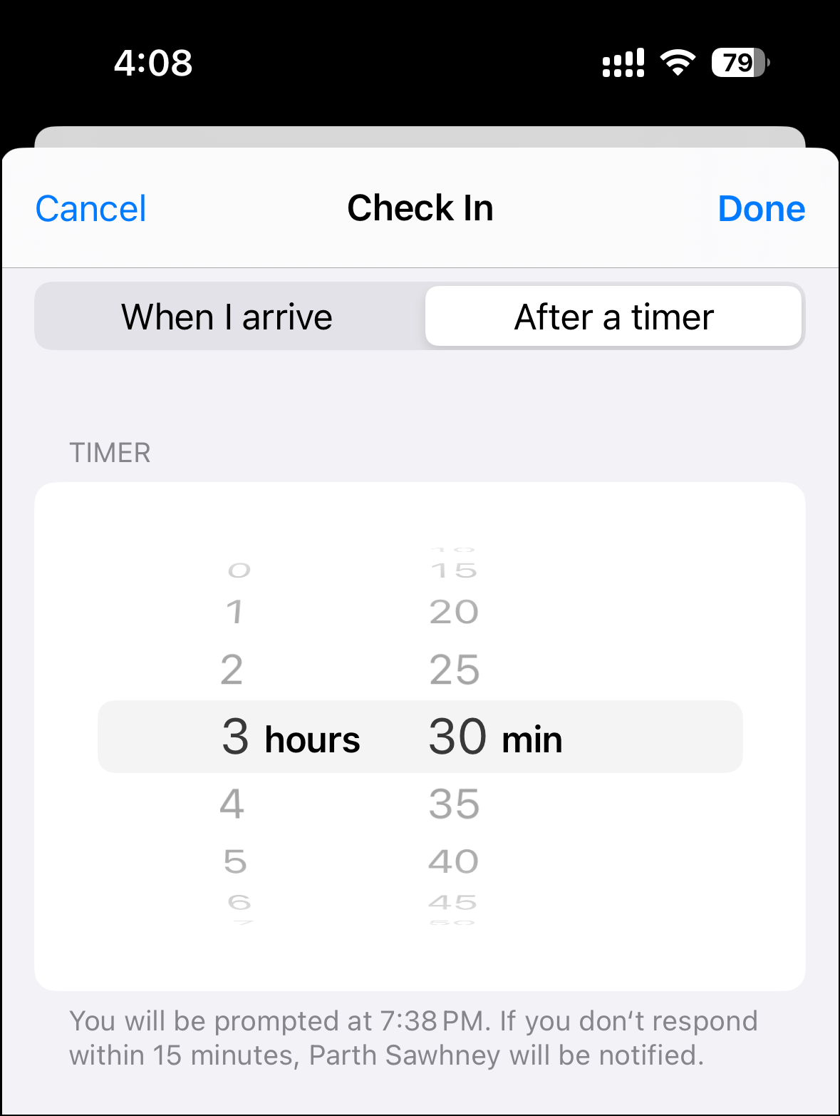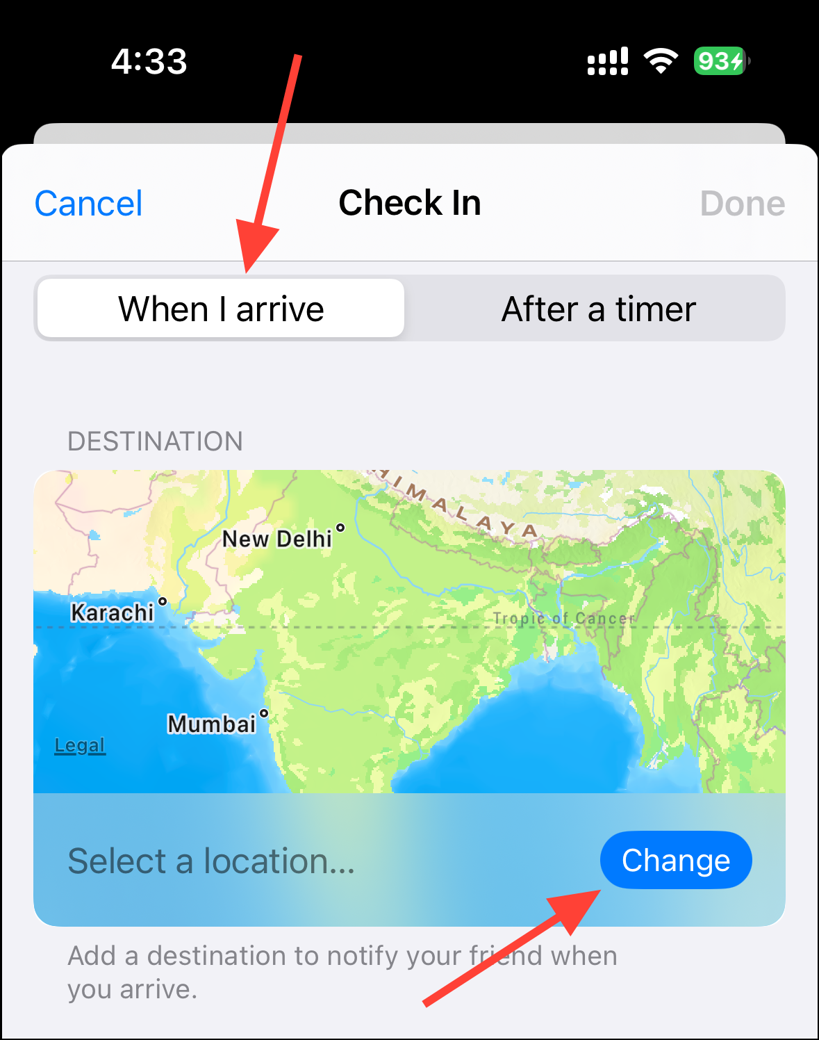 Setting a Destination-Based Check In: If you prefer to notify your contact upon arrival at a specific location, switch to the 'When I arrive' tab. Tap the 'Change' button to search and select your destination.