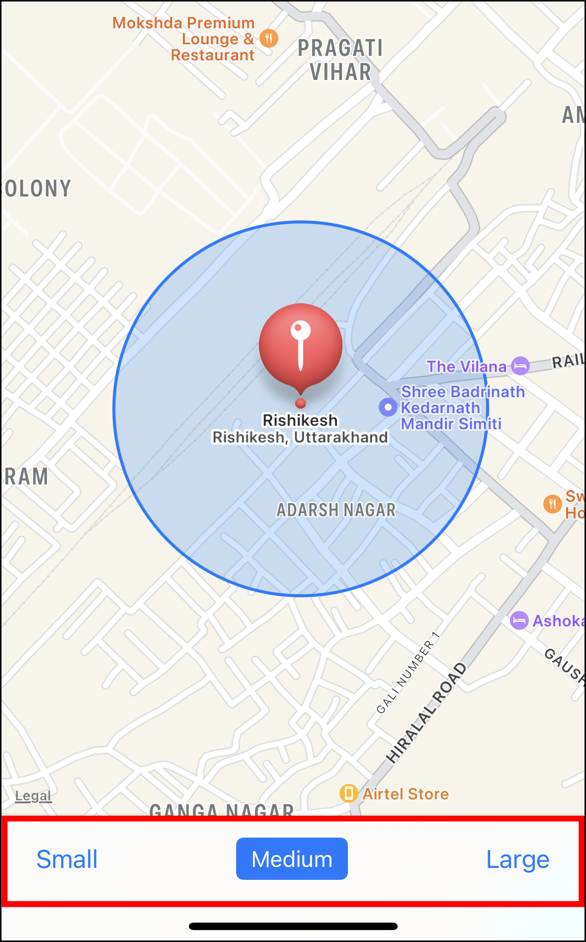 You can adjust the size of the destination area by selecting 'Small', 'Medium', or 'Large' circles, which modifies the perimeter around your chosen location.