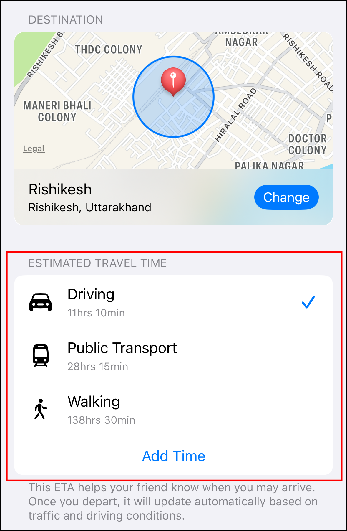 The app will then provide an estimated time of arrival (ETA) based on your mode of transportation and current traffic conditions. This ETA updates automatically once you begin your journey.