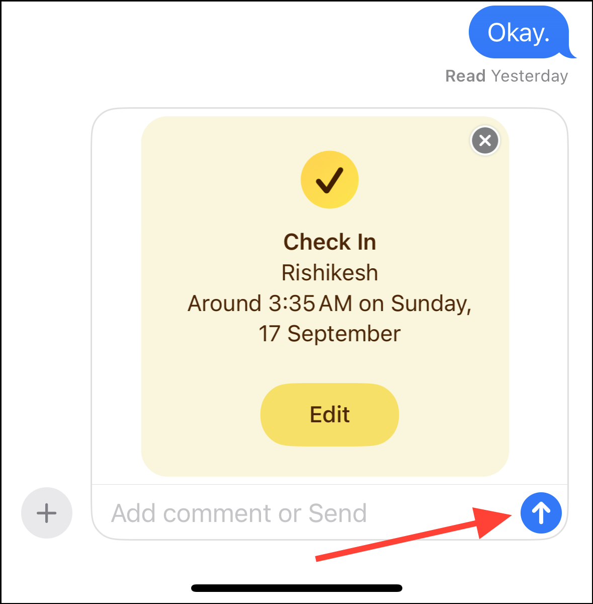 Step 10: The 'Check In' message will appear in the text input field. Tap 'Edit' if you need to adjust the destination or expected arrival time. Once everything is set, press the blue arrow to send the message to your contact.