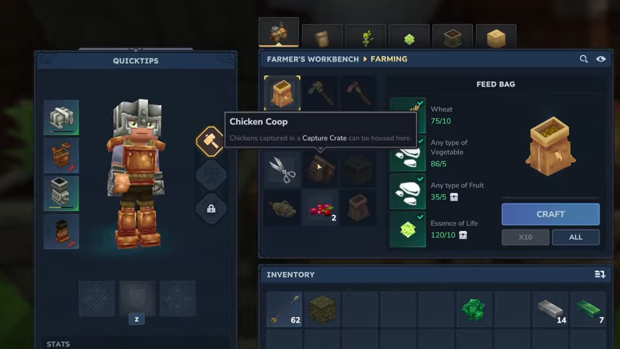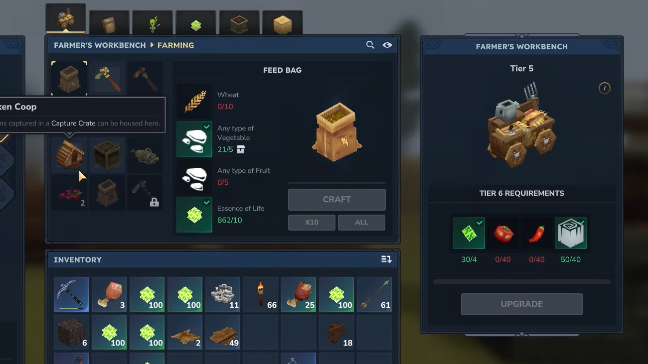 Step 2: Craft a capture crate at the farmer’s workbench, then head into zone one and look for wild chickens in grassy plains or at forest edges. Left-click a chicken while holding the crate to capture it, which turns the bird into a carried item.