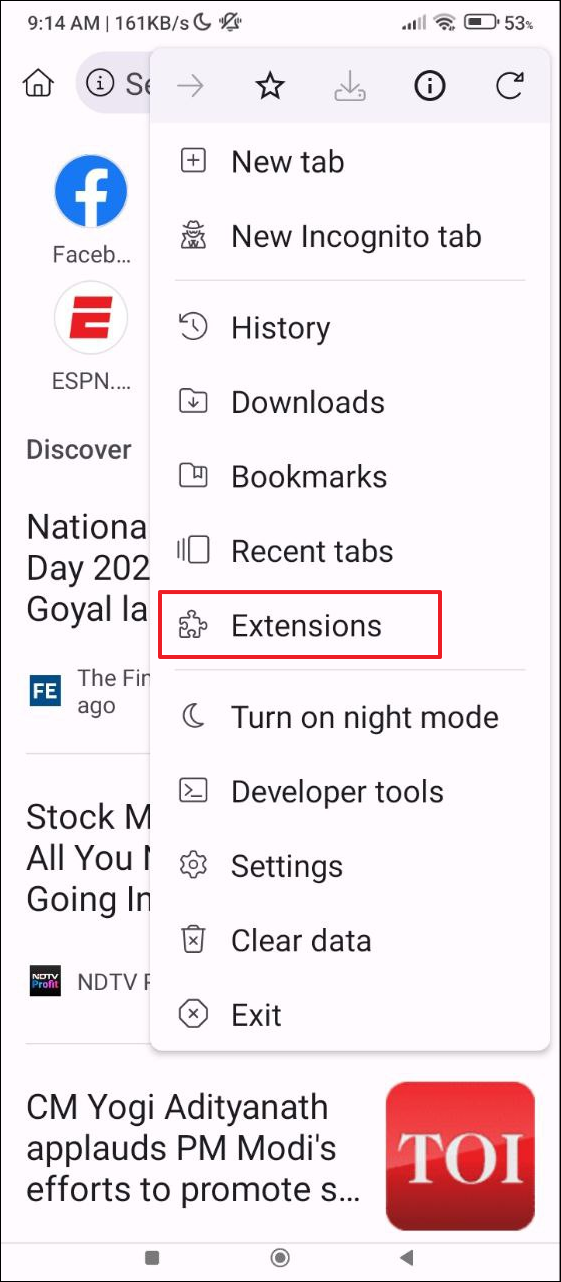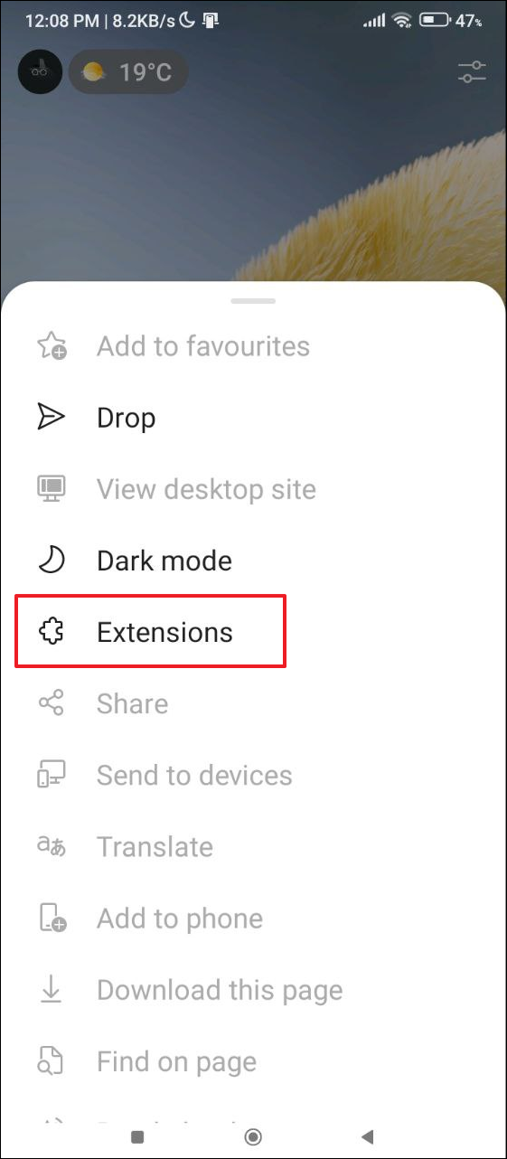 - Then tap on 'Extensions' in the menu that shows up on your screen.