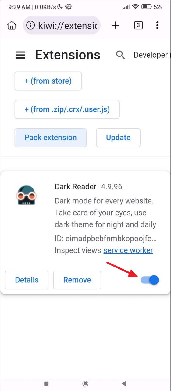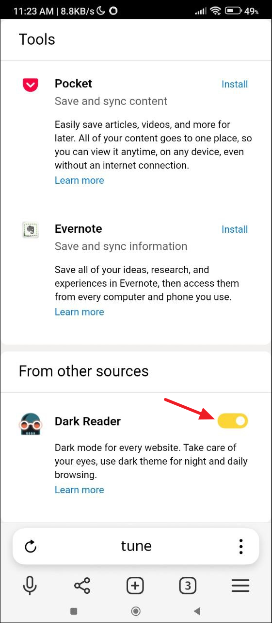 - To view the installed extensions, tap on the three dots at the top right and then on 'Extensions' again. From here you enable and disable installed extensions by tapping on their respective toggles.