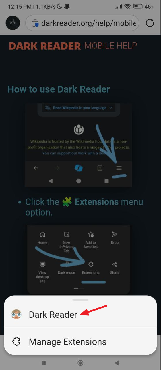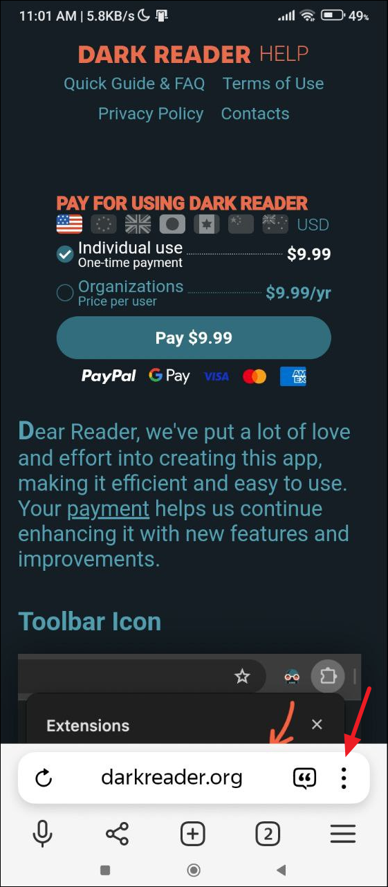 - To use the installed extension, tap on the three dots at the top right and then tap on the name of the extension in the dropdown menu.