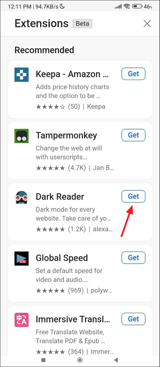 - You will see the list of available extensions in front of you. Tap on the 'Get' button next to the extension you want to install.