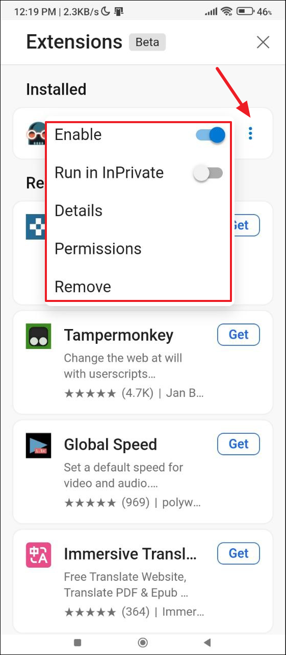 - Tap on the three dots on the right of the extension you want to manage and you will see various options, like enabling and disabling the extension, running it in InPrivate mode, removing permissions, and removing the extension.