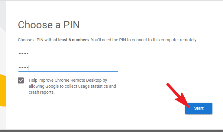 - Create a 6-digit PIN to secure your remote connection. Enter it twice for confirmation, then click Start.