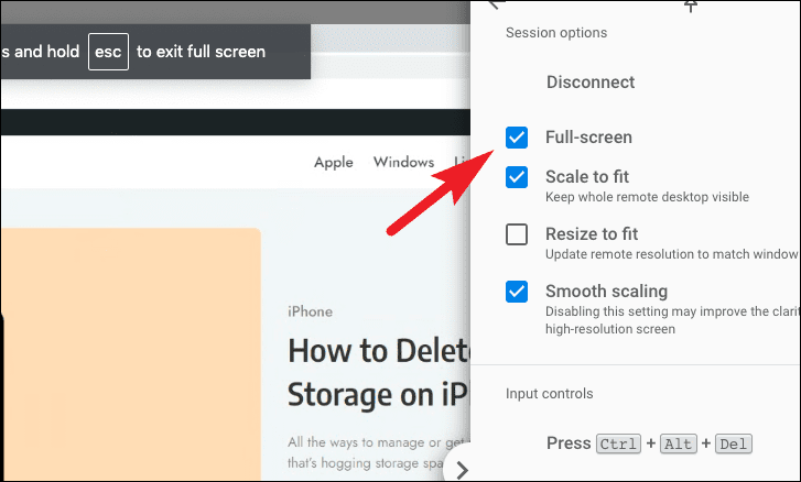 - To view the remote desktop in full screen, check the box next to Full-screen.