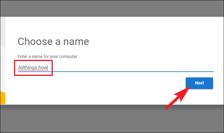 - Wait for the installation to complete. Once finished, a Chrome window will appear prompting you to name your computer. Enter a name of your choice and click Next.