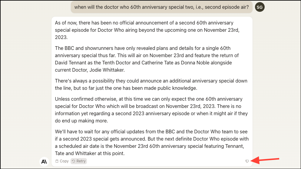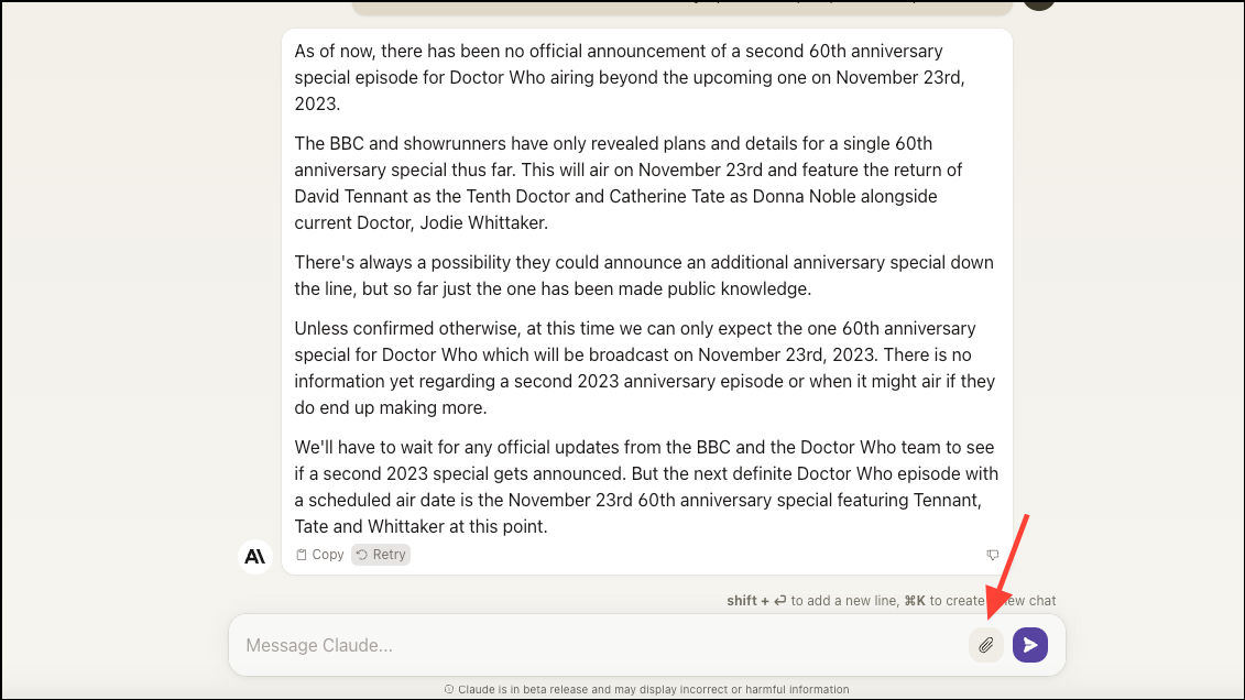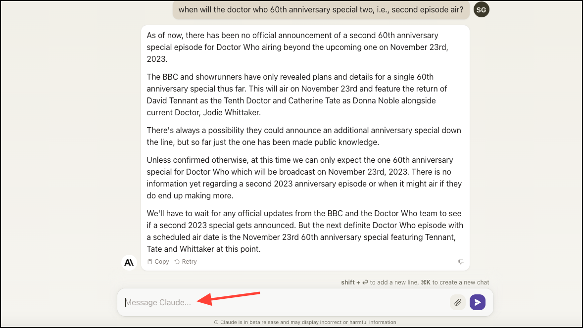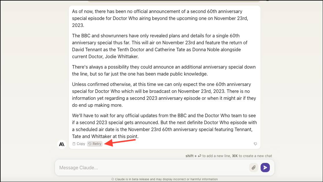 - You can click the 'Retry' button for the most recent question/ prompt if you'd like Claude to generate another response. Unfortunately, you cannot edit your question to re-submit it, nor can you see the original response from the conversational assistant.