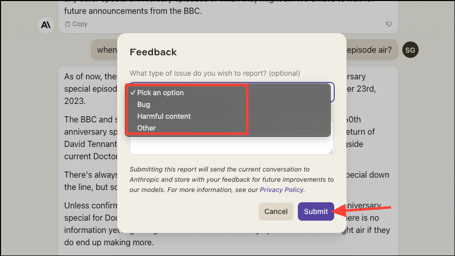 - You can also provide feedback for Claude's responses if the content is harmful, there's a bug, or for any other reason by clicking the 'Thumbs down button.