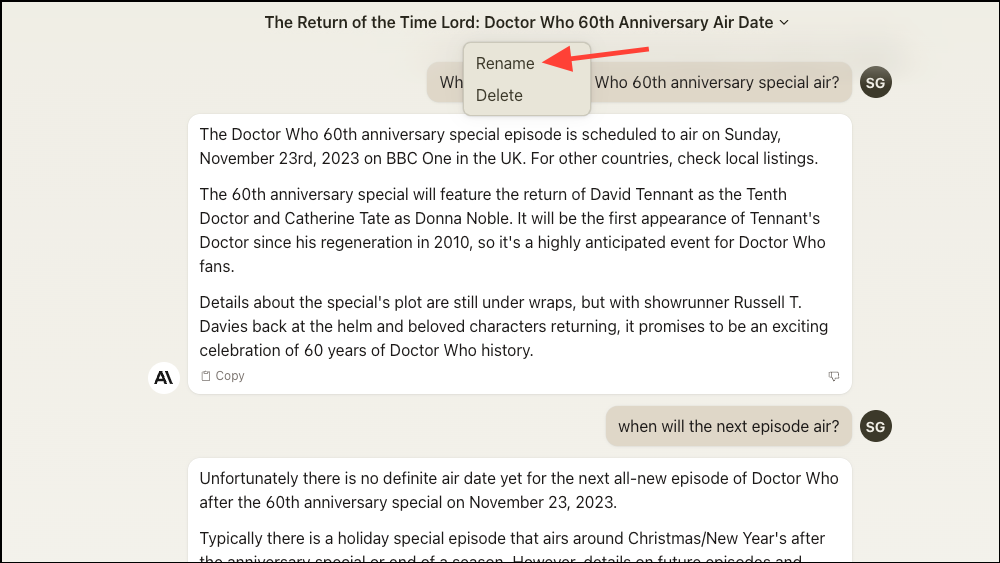 - Based on your conversation, it will name the chat on its own. To rename the chat, click the '[Chat name]' drop-down at the top and select 'Rename' from the options.