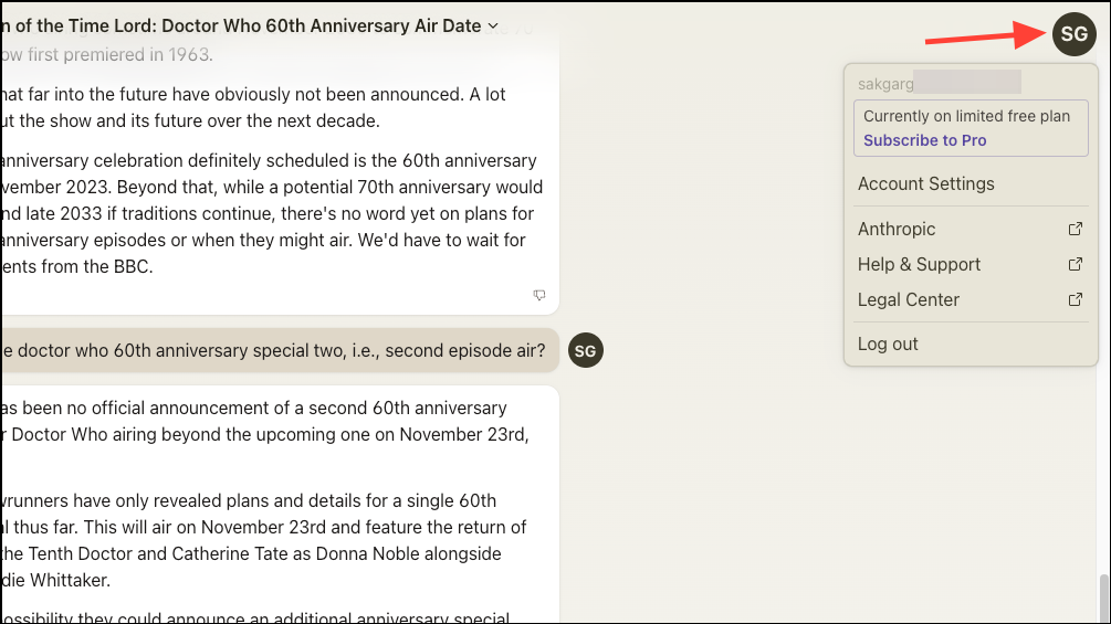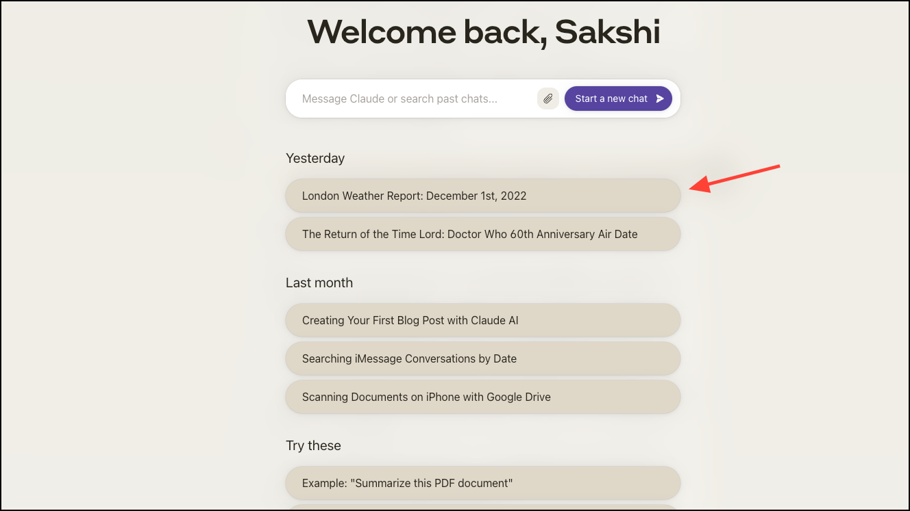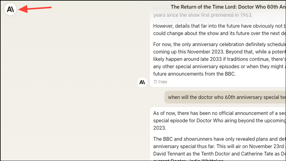 - To access all your chats, click the 'Anthropic' logo in the top-left corner of the screen. Here, you can start a new chat or open one of your previous chats. You can also use the
