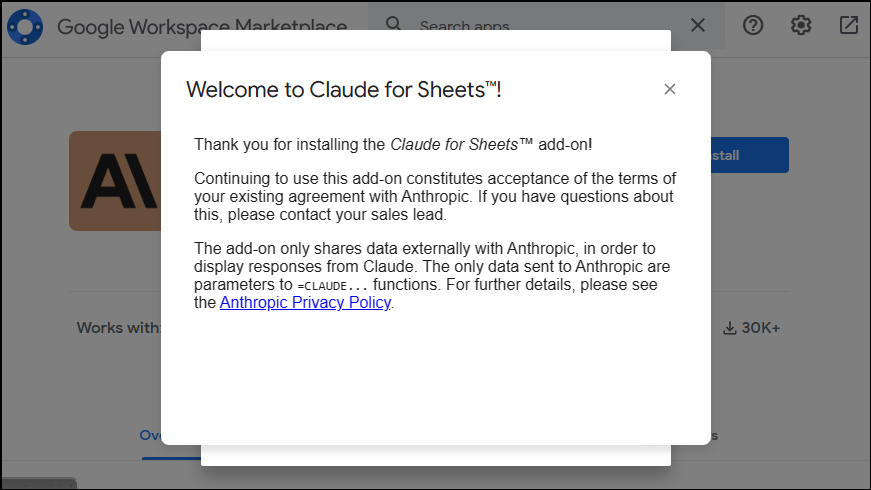 Step 5: After granting permission, a notification will confirm the successful installation of the Claude for Sheets extension.