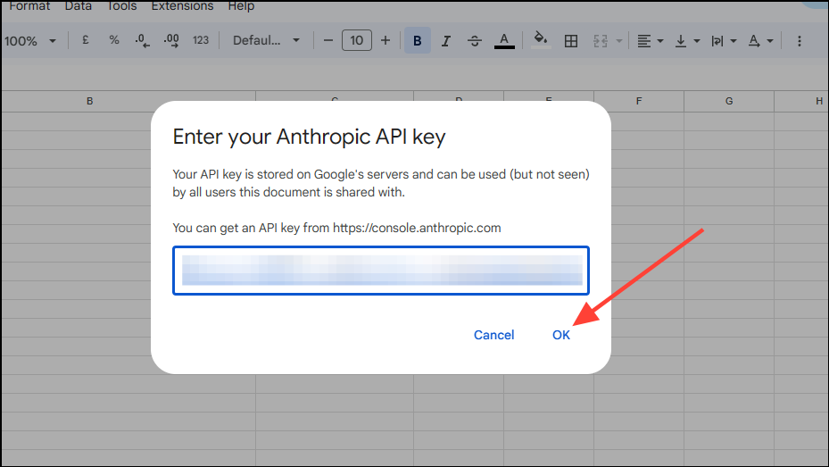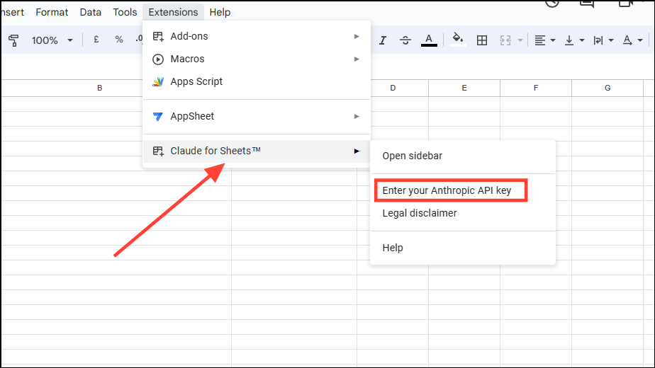 Step 6: Before using the extension, you must enter your API key. Go to the 'Extensions' menu, select 'Claude for Sheets', and then click on 'Enter Your Anthropic API Key'.