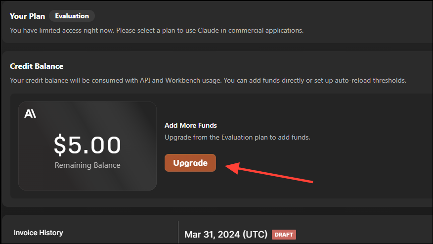 Step 8: To effectively use Claude AI with Google Sheets, you'll need some credits or a paid plan. You can claim $5 in free credits or choose a suitable paid plan by clicking on the 'Upgrade' button.