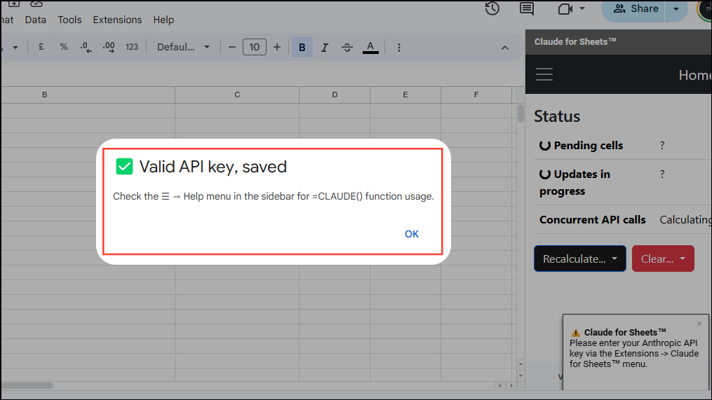 Step 8: A confirmation message will appear, indicating that your API key has been saved successfully. The Claude for Sheets extension panel will now be visible on the right side of your screen.