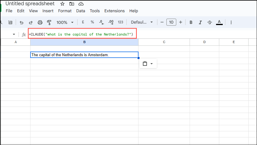 Step 1: For example, to find the capital of the Netherlands, type =CLAUDE("What is the capital of the Netherlands?") into a cell or the formula bar.