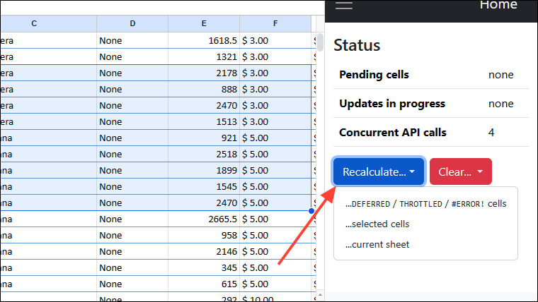 Step 3: Choose whether to recalculate the entire sheet or only the selected cells. Click 'Deferred/Throttled/#Error: Cells' to initiate the recalculation.