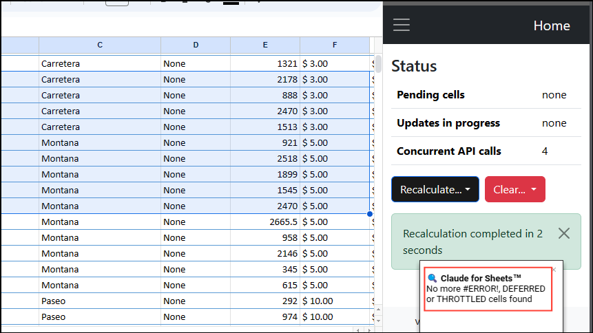 Step 4: Claude AI will process and update the selected cells accordingly.
