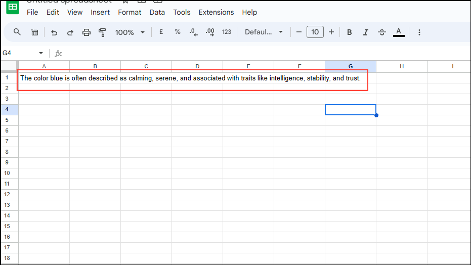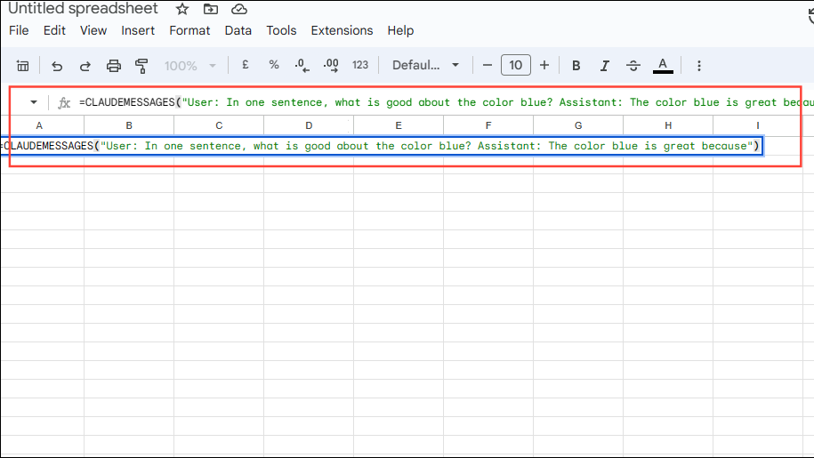 Step 1: Use the function as follows: =CLAUDEMESSAGES("User: In one sentence, what is good about the color blue? Assistant: The color blue is great because").