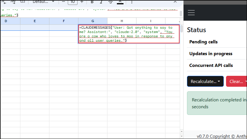 Step 3: To use CLAUDEMESSAGES() with a system prompt and specify a model name, input: =CLAUDEMESSAGES("User: Got anything to say to me? Assistant:", "claude-2.0", "system", "You are a cow who loves to moo in response to any and all user queries.").