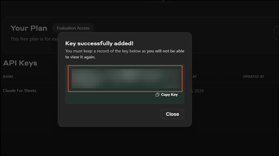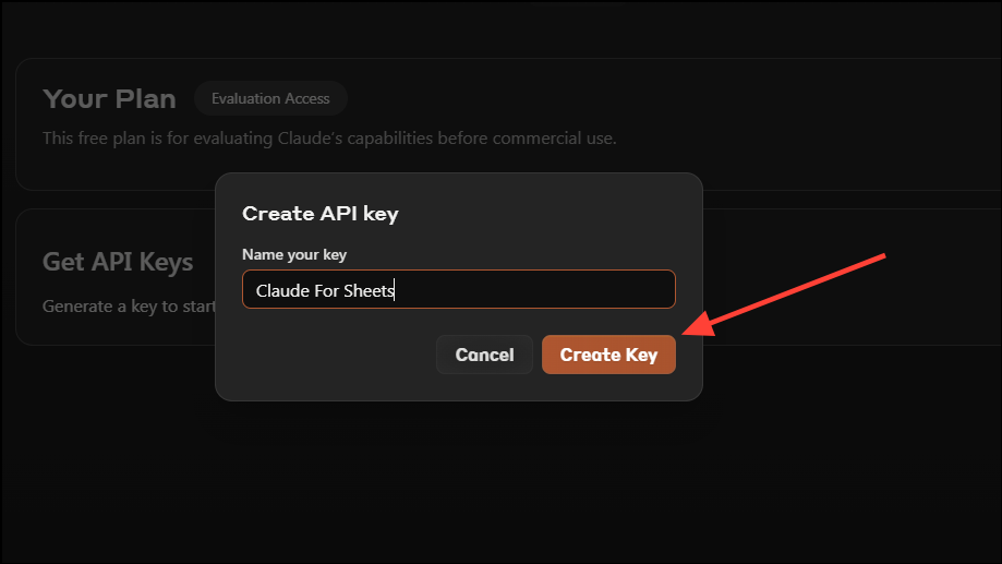 Step 5: Click on 'Create Key', and a pop-up will prompt you to name your key. Provide a descriptive name like 'Claude For Sheets'.