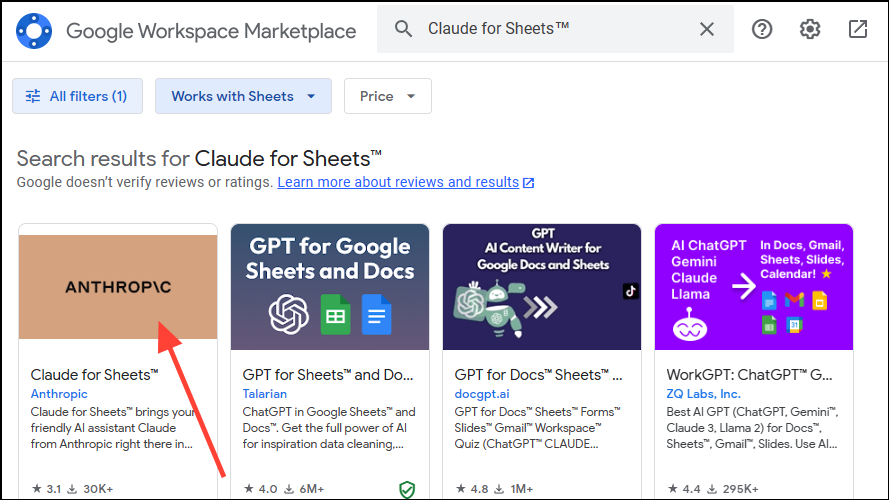 Step 3: In the search bar, type 'Claude for Sheets' and click on the extension when it appears.