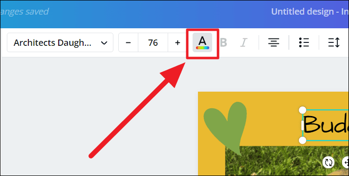 While changing text color. Type out your text in the design, select it. Then click the button with a capital ‘A’ and a rainbow underline. This is the ‘text color’ button.