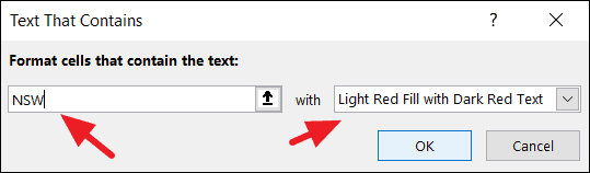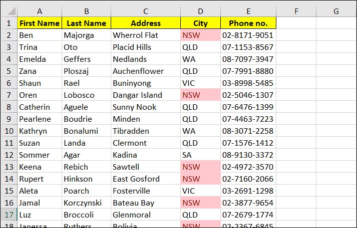You can also use conditional formatting to highlight cells containing specific text. For example, suppose you want to identify all employees located in New South Wales (NSW).