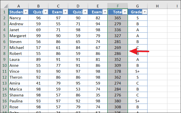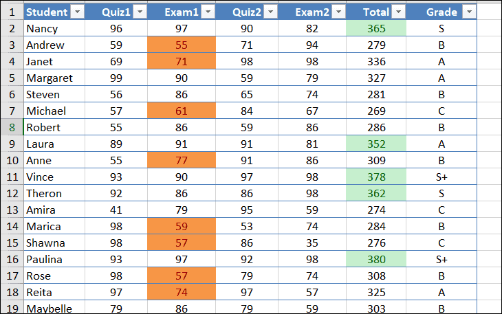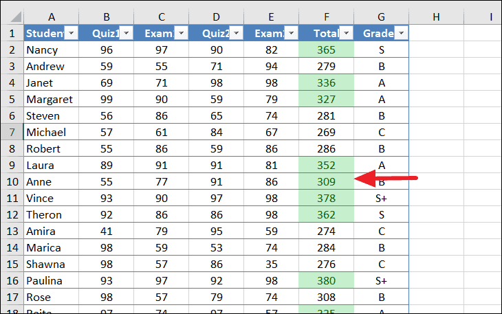 The top 10 values in the 'Total' column will now be highlighted, allowing you to quickly identify the highest-scoring students.