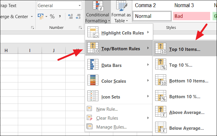 Step 2: Go to the Home tab, click Conditional Formatting, hover over Top/Bottom Rules, and select Top 10 Items...