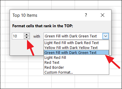Step 3: In the dialog box, specify the number of top items you want to highlight. By default, it's set to 10, but you can adjust it using the arrows or by typing a number. Choose a formatting style from the list or create a custom format, then click OK.