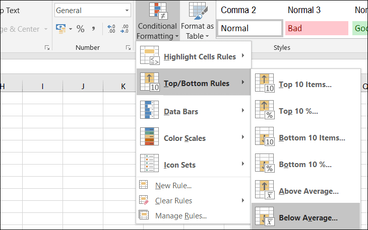 Step 2: Go to Home > Conditional Formatting > Top/Bottom Rules > Below Average...