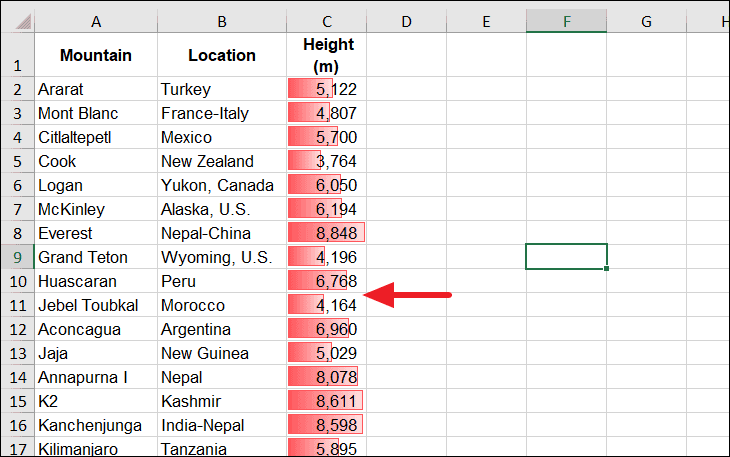 The data bars will appear within the selected cells, instantly comparing values across the range. Unlike other conditional formatting options, data bars display in all cells rather than only those that meet certain conditions.