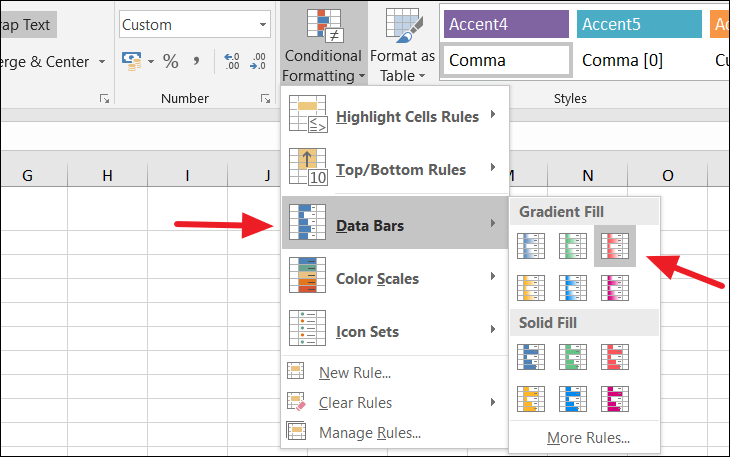 Step 2: Navigate to the Home tab, click Conditional Formatting, hover over Data Bars, and choose a style from the gradient or solid fill options.