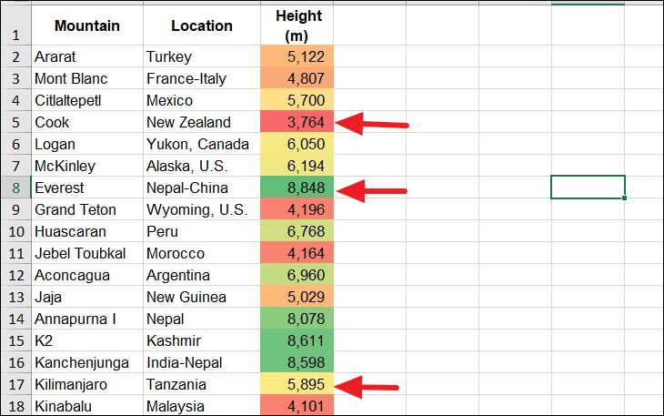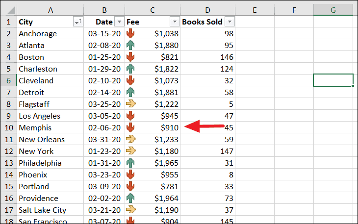 The icons will appear in the cells, representing the relative value of each cell. For example, green upward arrows may indicate higher values, yellow sideways arrows represent middle values, and red downward arrows signify lower values.