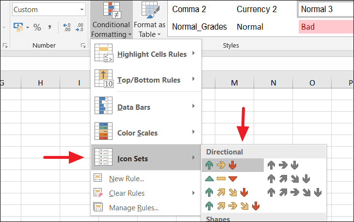 Step 2: Navigate to the Home tab, click Conditional Formatting, hover over Icon Sets, and select an icon style that suits your data. For this example, we'll choose the first option under the 'Directional' category.