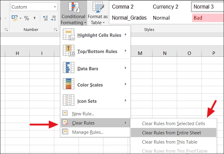 Step 2: Choose whether to clear rules from the selected cells or the entire sheet. Selecting Clear Rules from Entire Sheet will remove all conditional formatting applied to the worksheet.