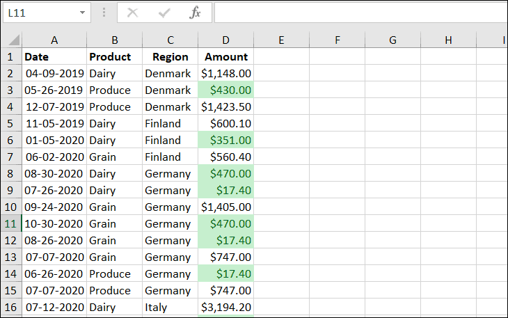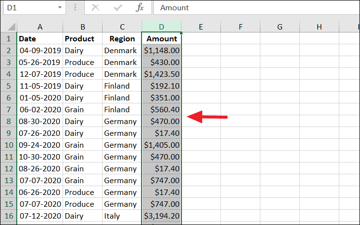 Step 1: Select the range of cells where you want to apply the conditional formatting rule. In this case, select column D, which contains the 'Amount' values you wish to evaluate.