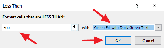 Step 3: In the 'Less Than' dialog box that appears, enter 500 in the field that asks for the value. Choose the formatting style you prefer from the dropdown menu next to it. You can select from predefined formatting options or create a custom format.