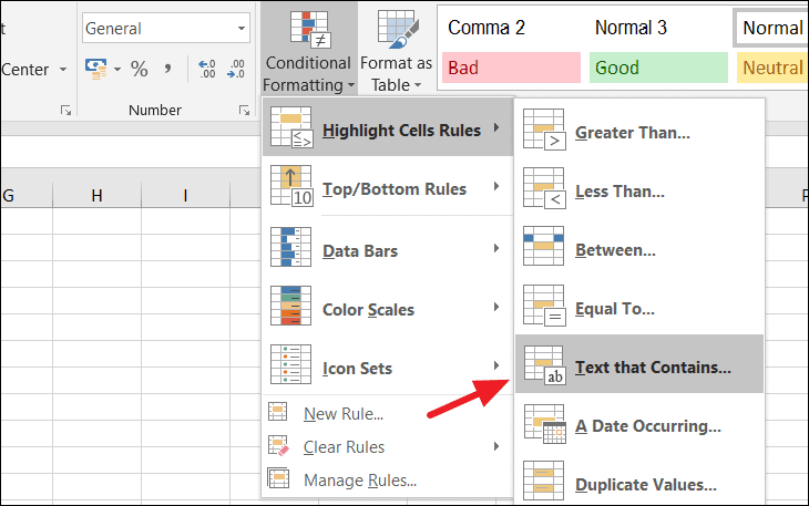 Step 2: Go to the Home tab, click Conditional Formatting, hover over Highlight Cells Rules, and choose Text that Contains...
