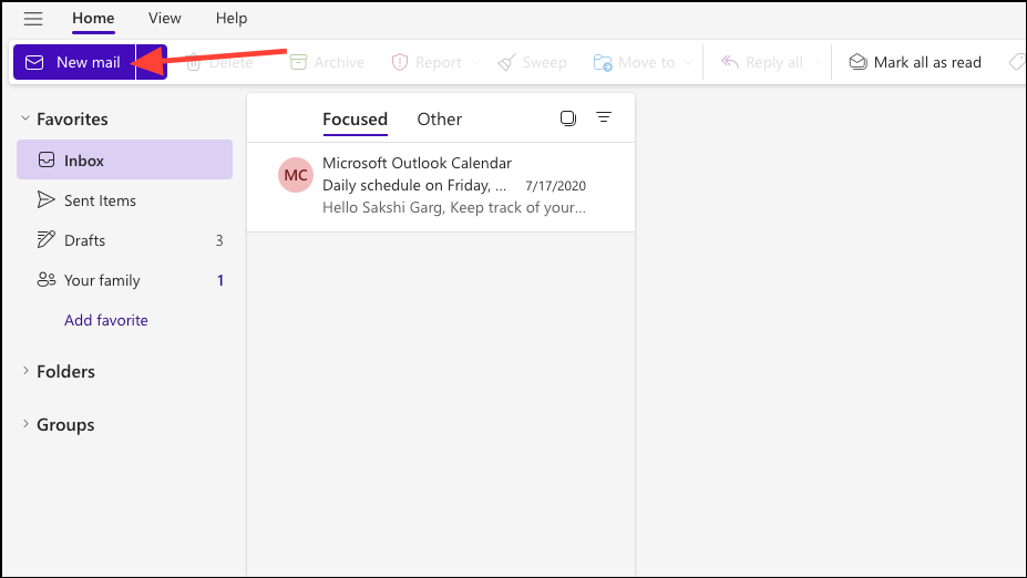 - Click on the 'New Mail' button from the 'Home' tab. You can also open a draft or reply to an ongoing conversation, depending on how you want to send the email.