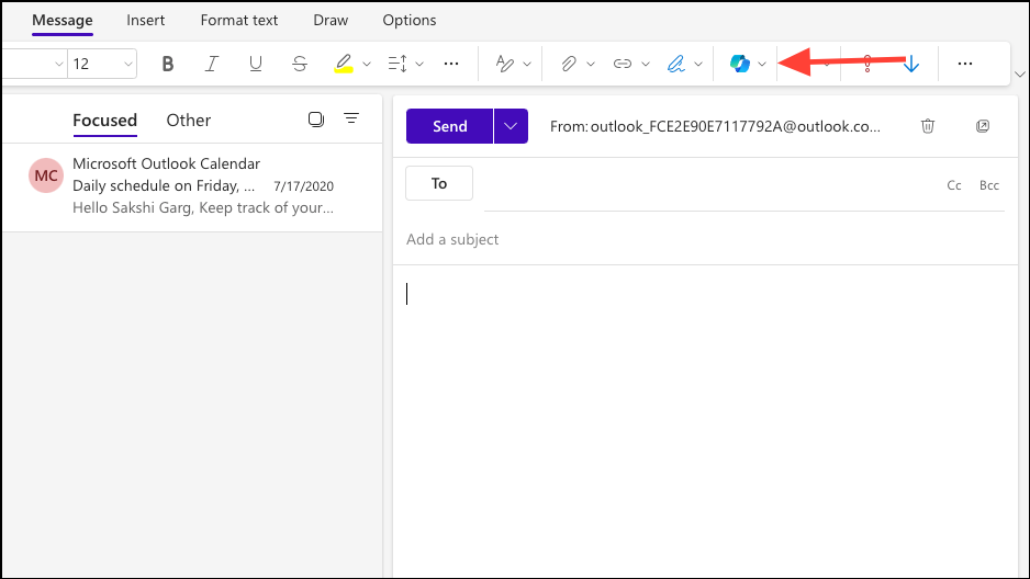 - Start composing a new mail in the Outlook app and write your email. It should be at least 100 characters long for Copilot to analyze it effectively.
