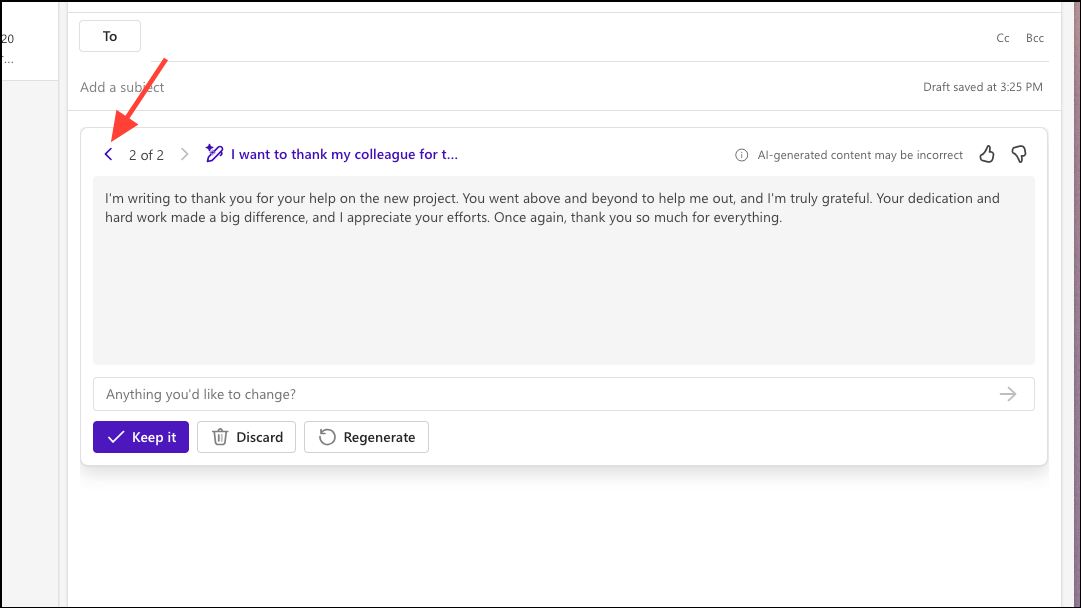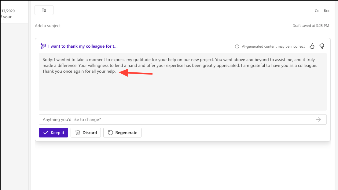 - But if you like the email Copilot has drafted, click the 'Keep it' button and click the 'Discard' button if you don't want to add it to your email.