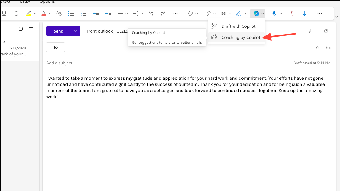 In addition to drafting emails from scratch, Copilot can also help you with emails you have already written. With email coaching, Copilot will analyze the mail you've written and come up with suggestions that will make it more professional. Here's how it works.