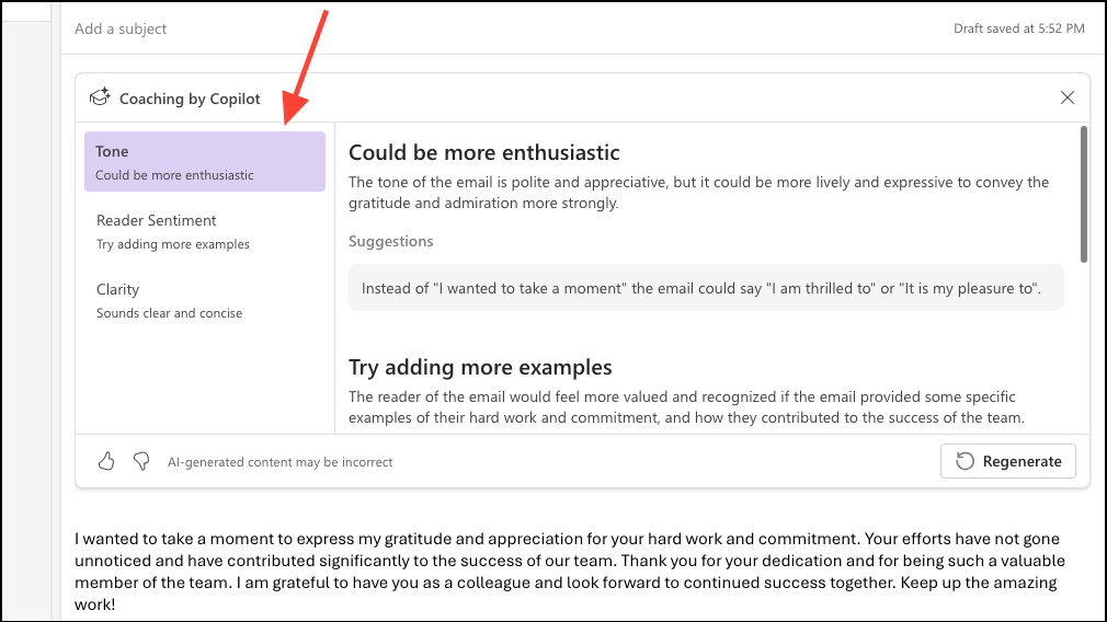 - Copilot will begin analyzing the content right away. Wait until it completes the analysis. The categories it reviews the email for are 'Tone', 'Reader sentiment', and 'Clarity'.