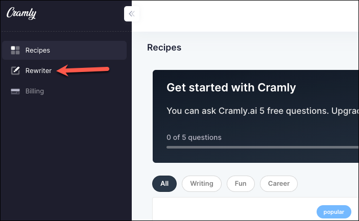 Once your account is created, you can start using Cramly AI. If you want to use any of the tools except the paraphraser, go to 'Recipes' from the navigation menu on the left of the Cramly dashboard.