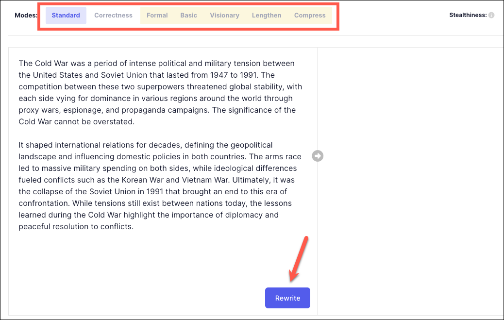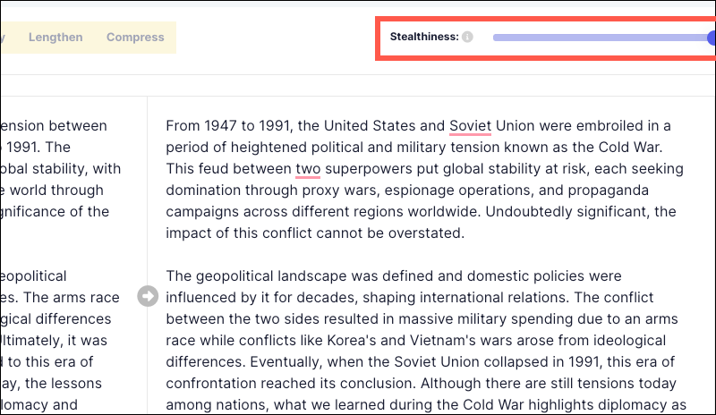 Before generating the output, you can also adjust the 'stealthiness' of the tool. The more the stealthiness, the less likely the output would be flagged by AI detection tools.