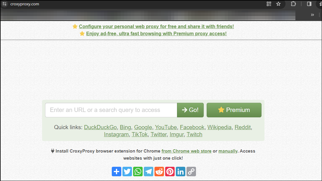 - Launch the web browser on your desktop or smartphone and visit the CroxyProxy website. The website has a search bar in the center and some Quick Links below it.